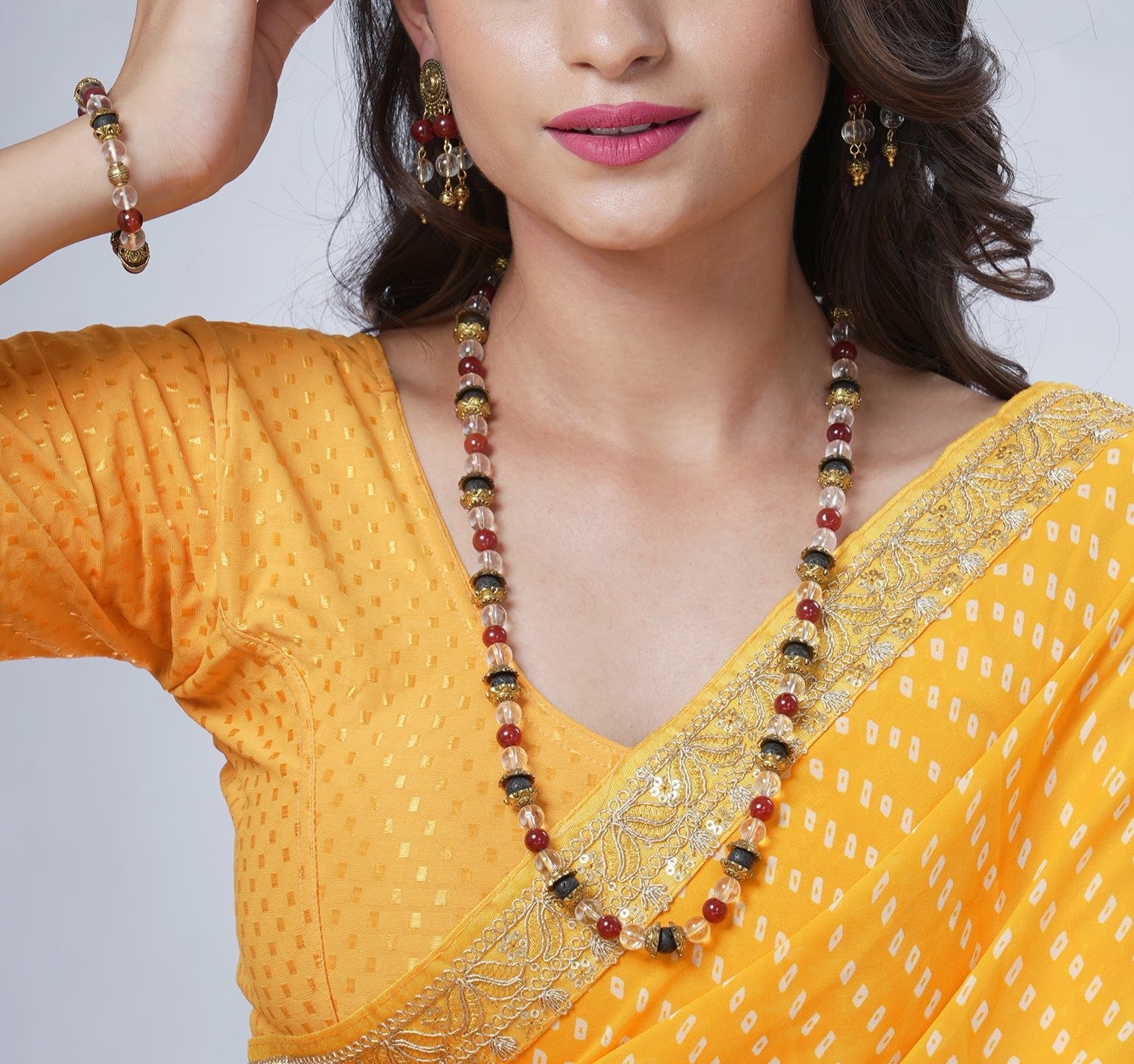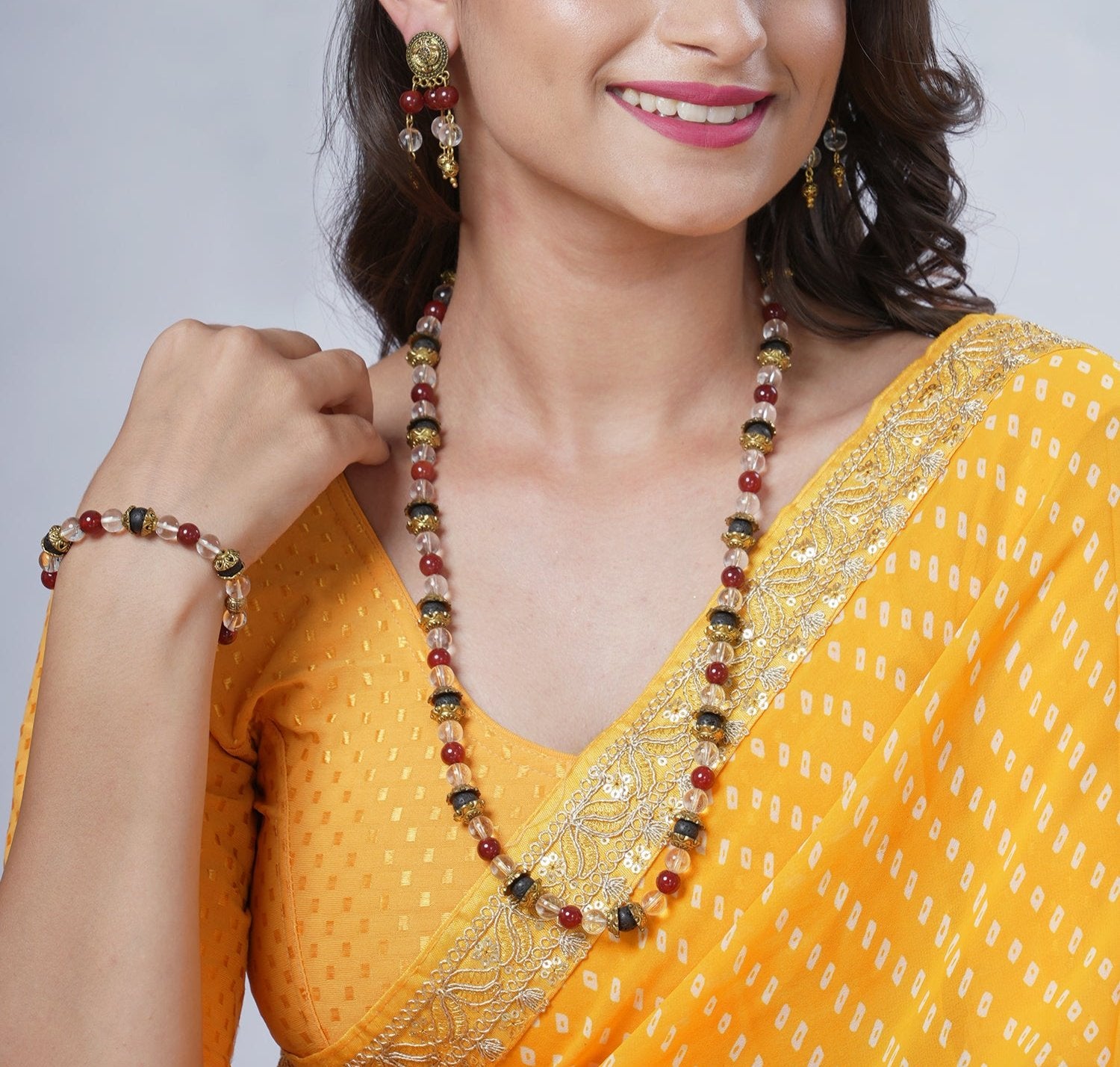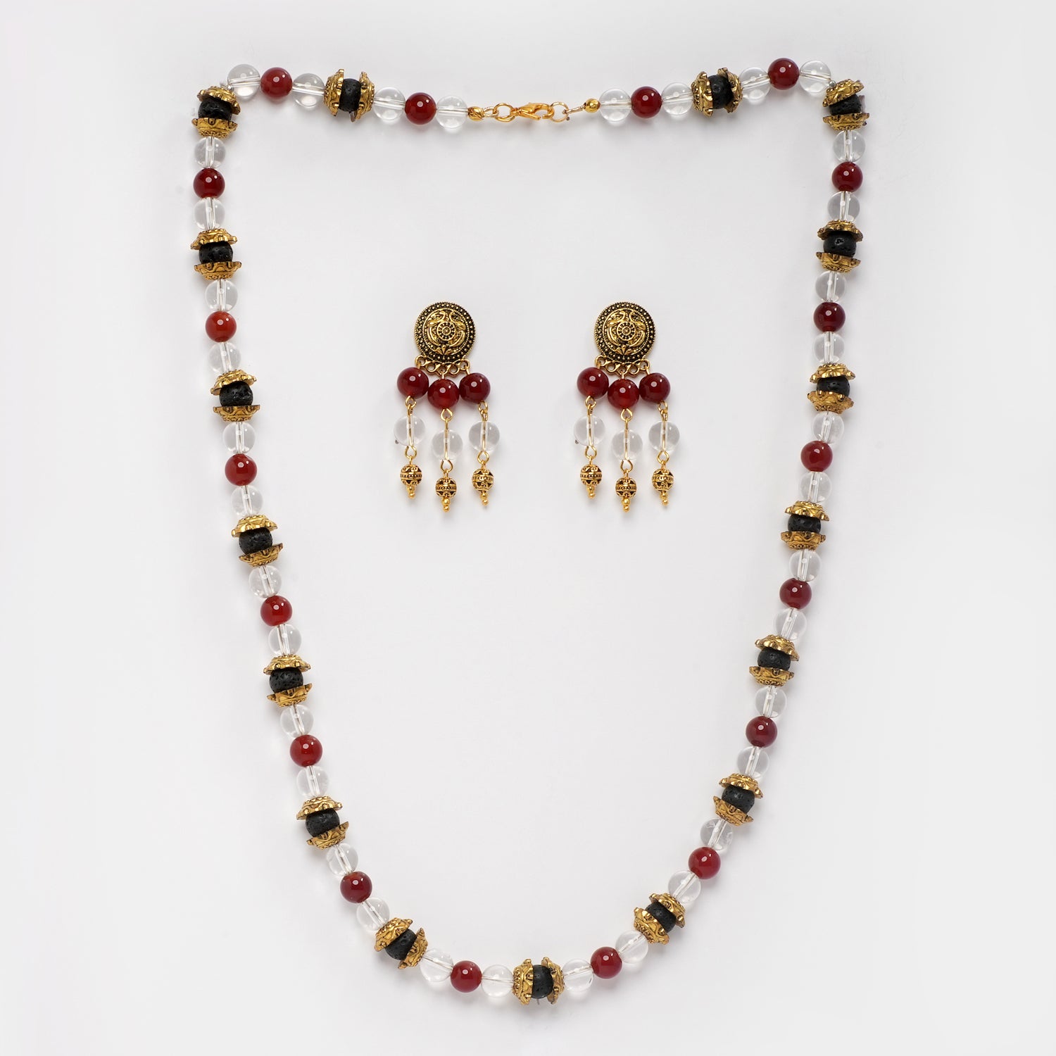 Elevate your style and well-being with this exquisite necklace and earring set, featuring the stunning combination of clear quartz, red onyx, and lava.