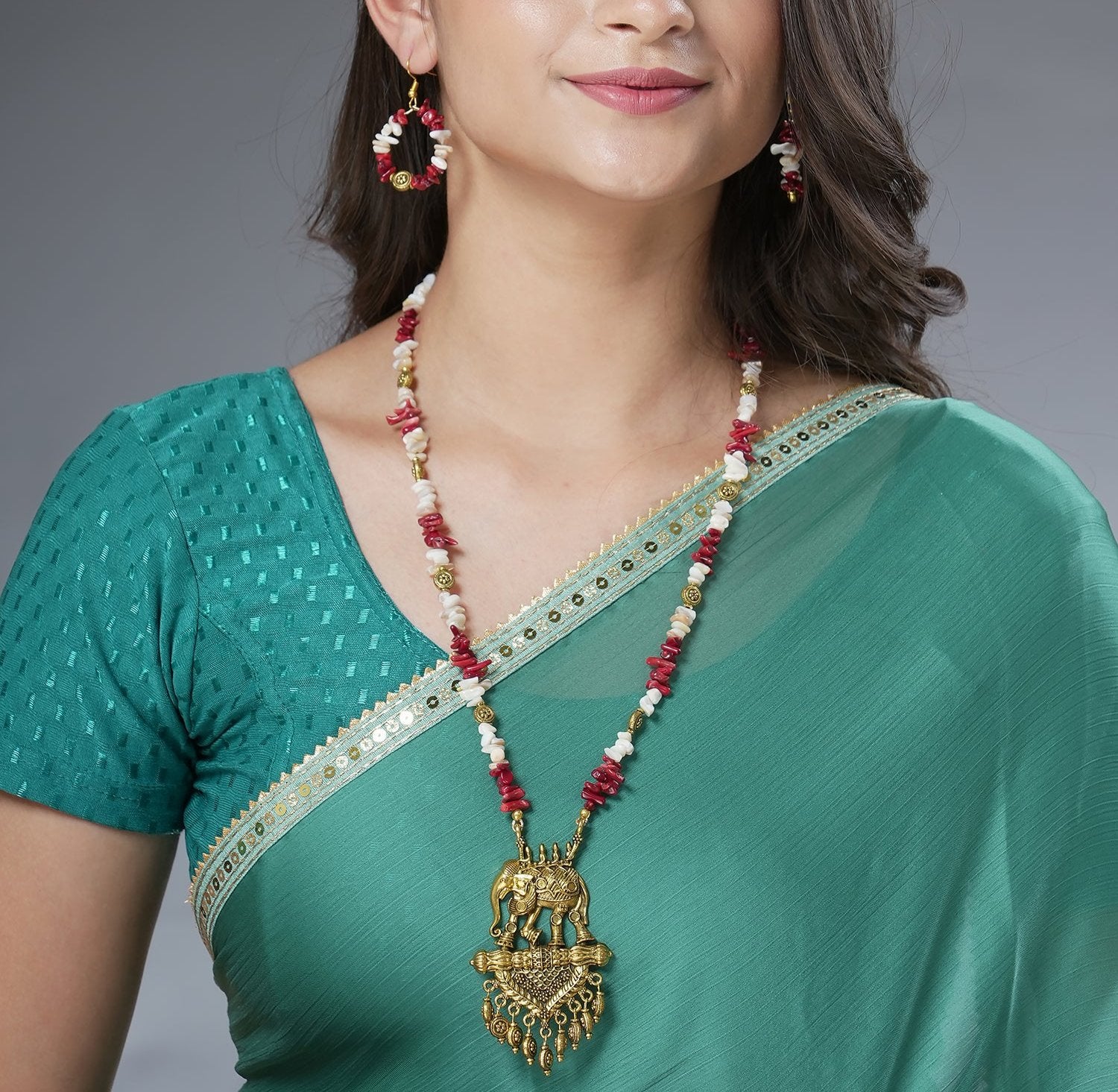 Elevate your style and well-being with this exquisite necklace and earring set, featuring the stunning combination of uncut white mother of pearl and vibrant coral.