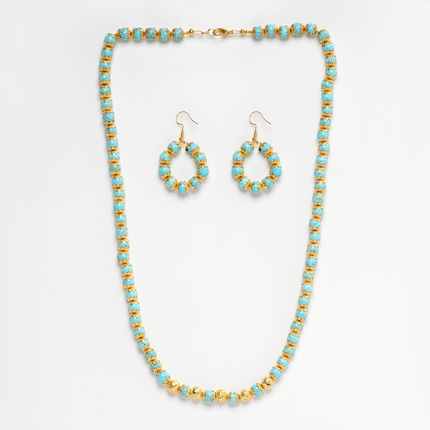 Elevate your style with this exquisite necklace and earring set, featuring the stunning combination of faceted firoza and golden lava.