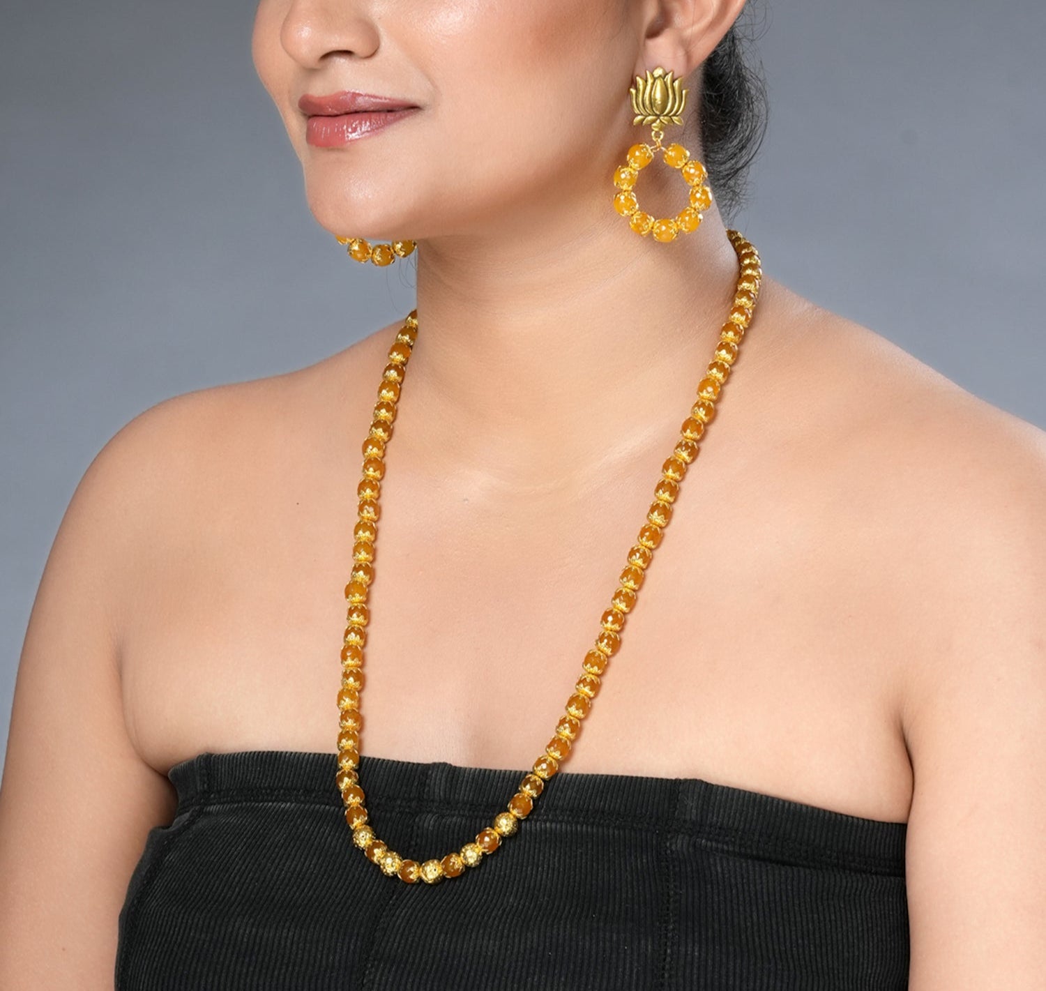 Elevate your style and well-being with this exquisite necklace and earring set, featuring the stunning combination of faceted yellow jade and golden lava.