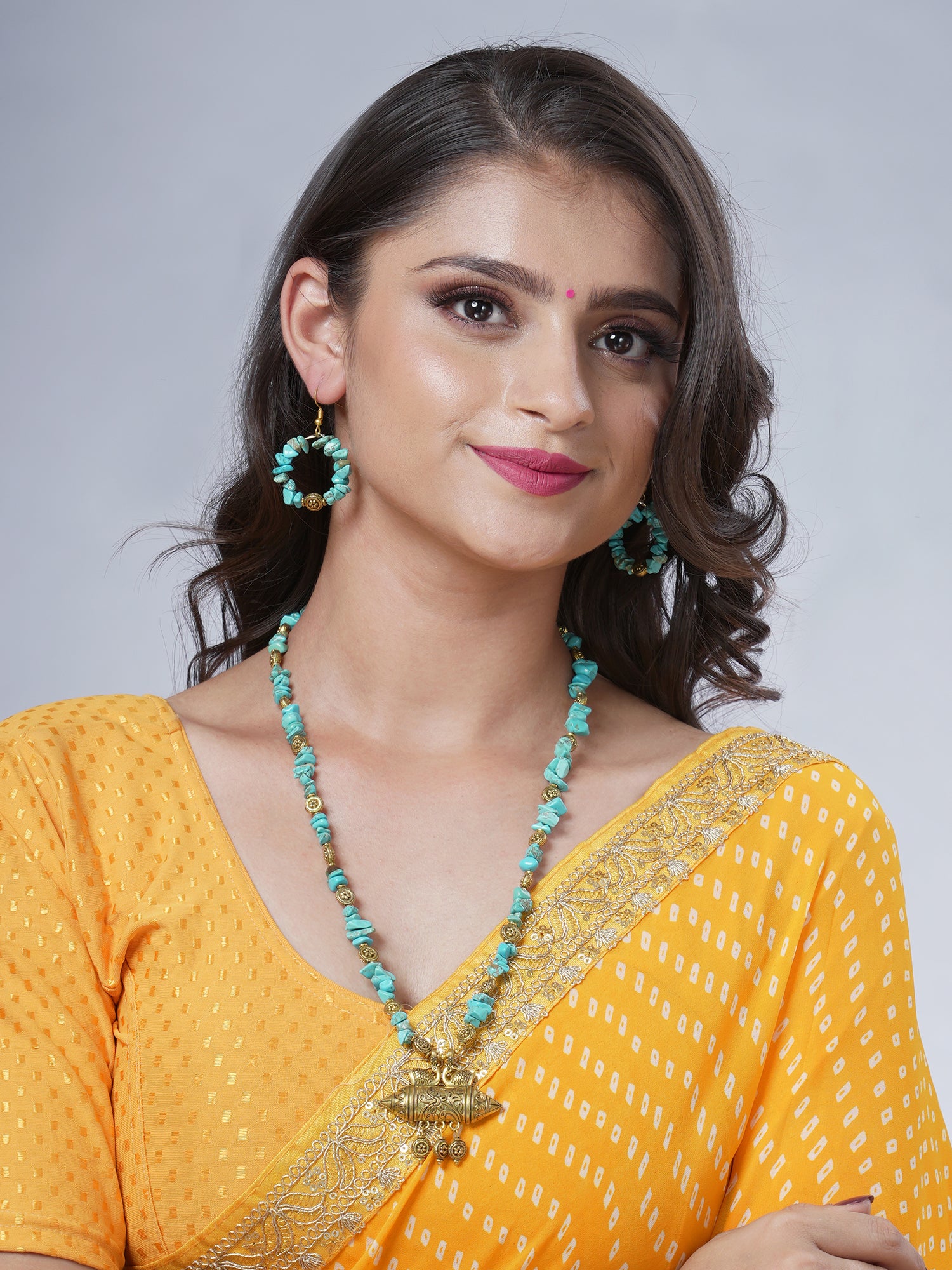 Elevate your style with this exquisite necklace and earring set, featuring the stunning beauty of uncut firoza and gold.