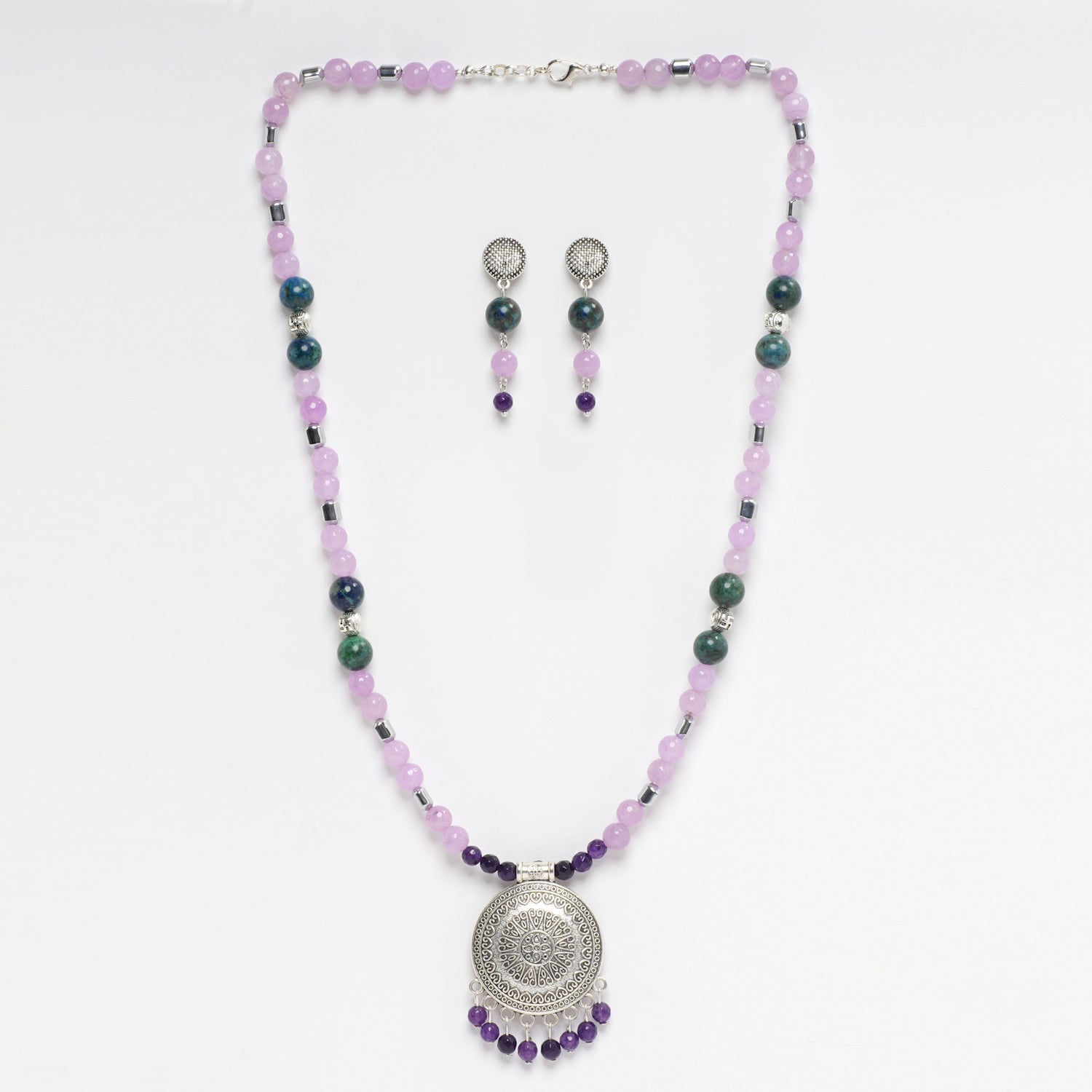 Elevate your style with this exquisite necklace and earring set, featuring the stunning combination of purple faceted jade and azurite.