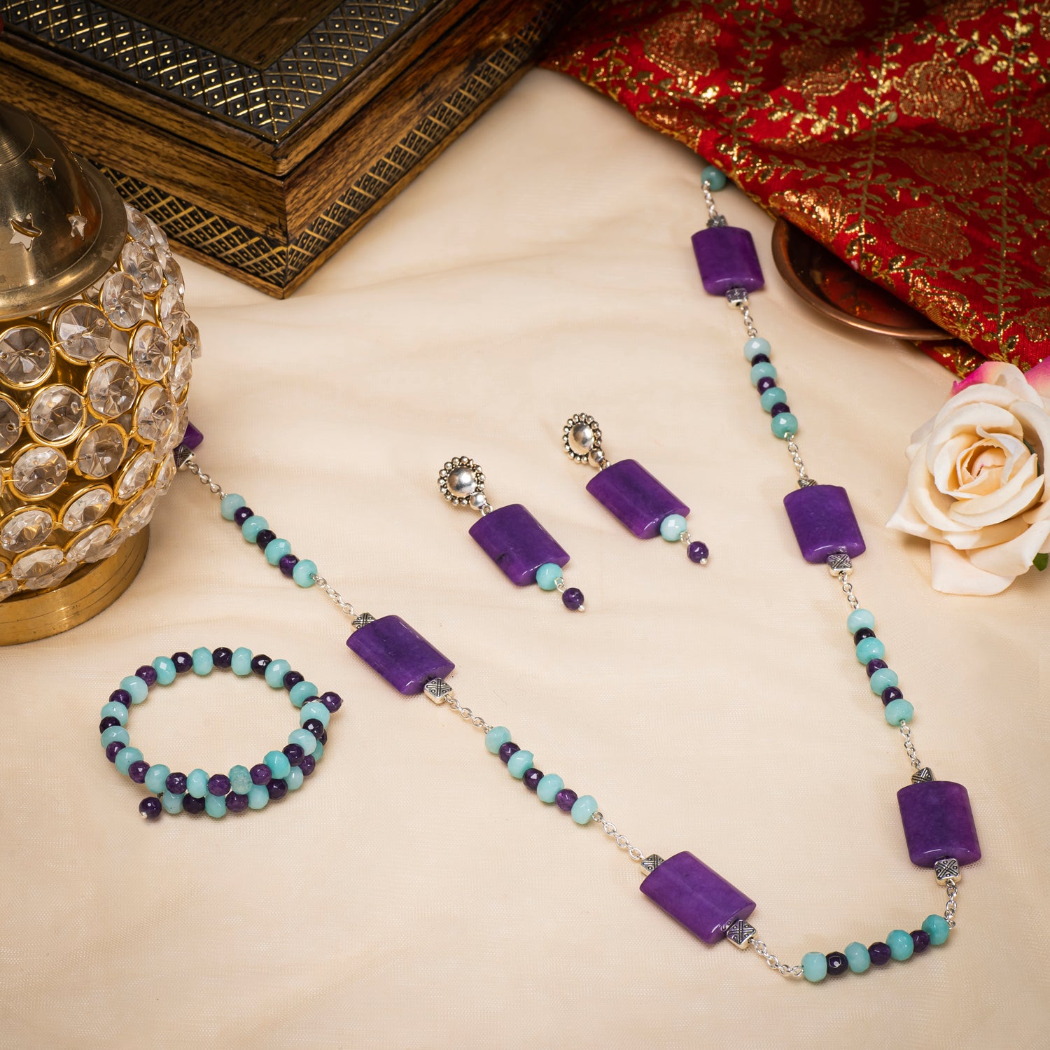 Elevate your style with this exquisite necklace and earring set, featuring the stunning combination of purple agate and blue jade.