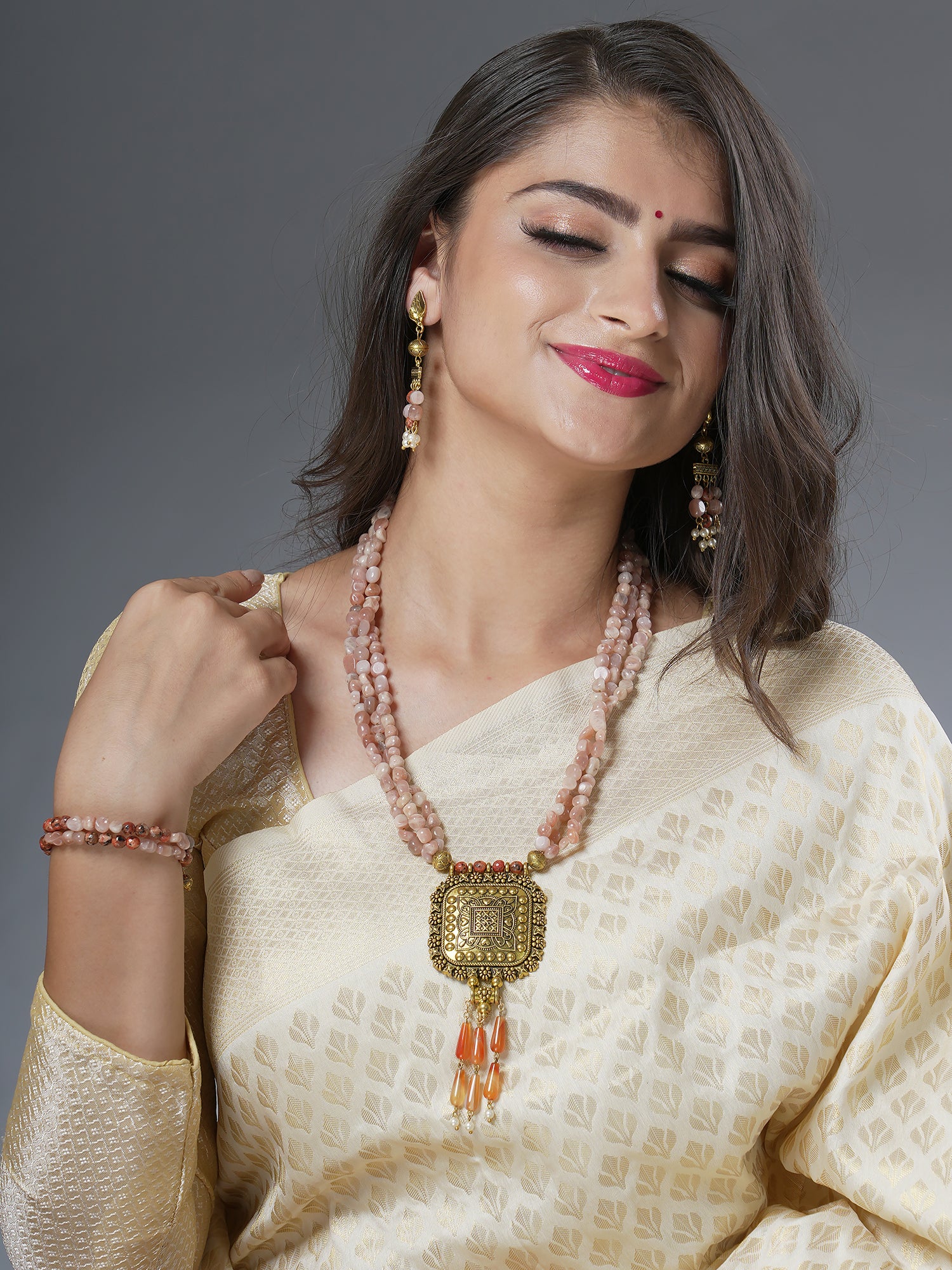 With Eykaa's Peach Moonstone, Carnelian, Dalmatian, and Shell Pearl bracelet, you can boost your style.