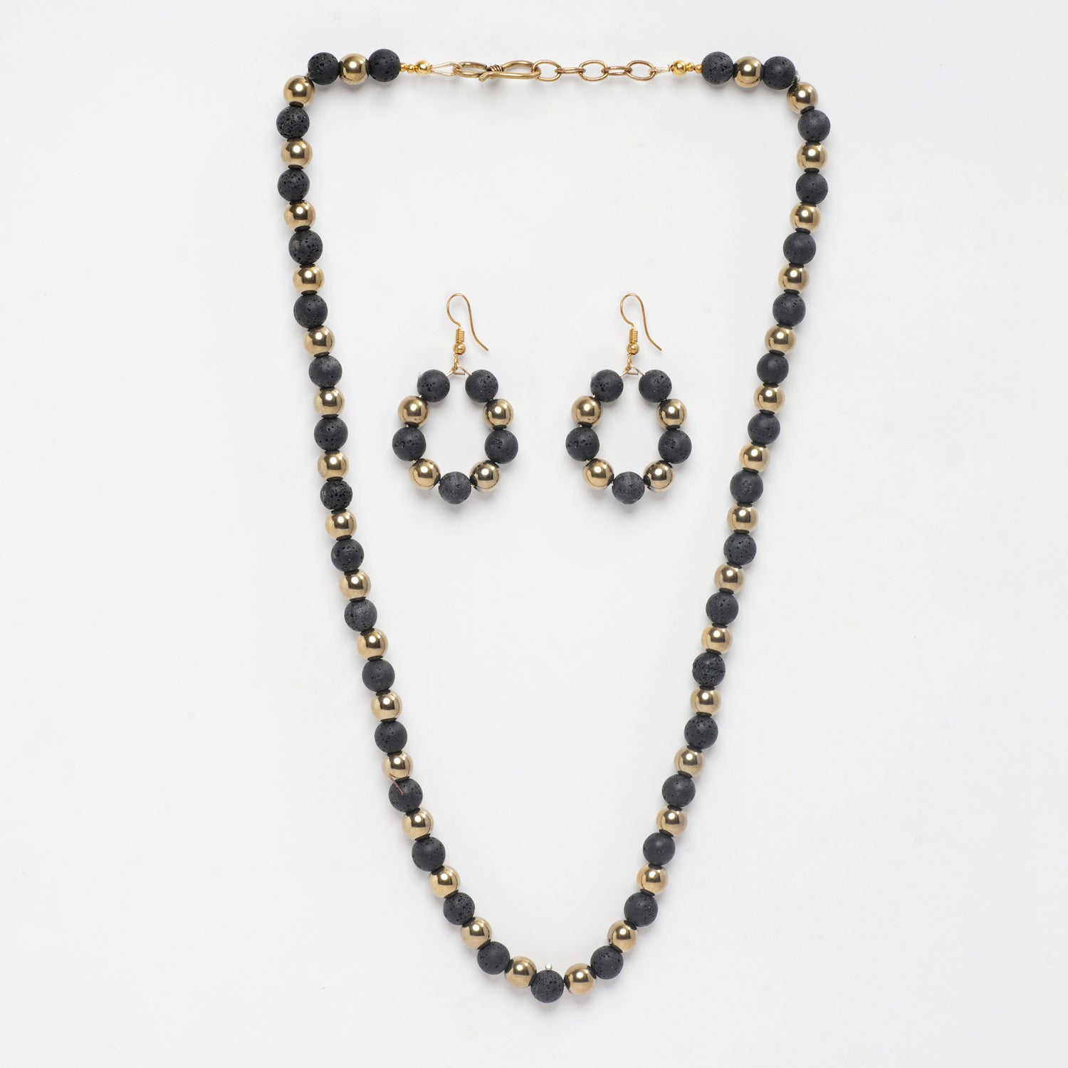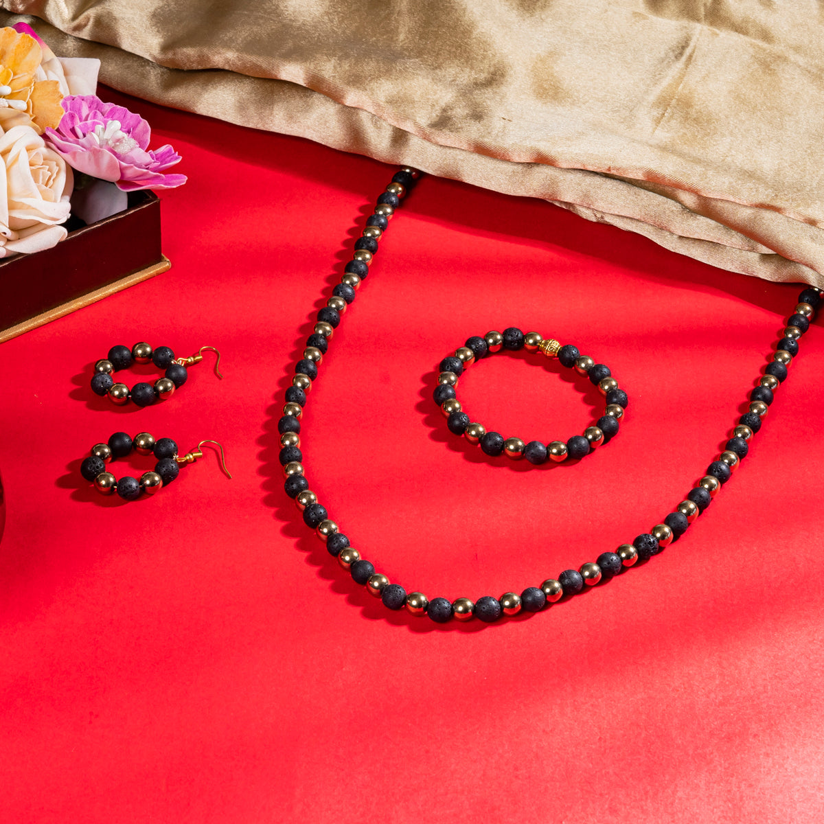 Elevate your style and well-being with this exquisite necklace and earring set, featuring the stunning combination of lava and golden hematite.