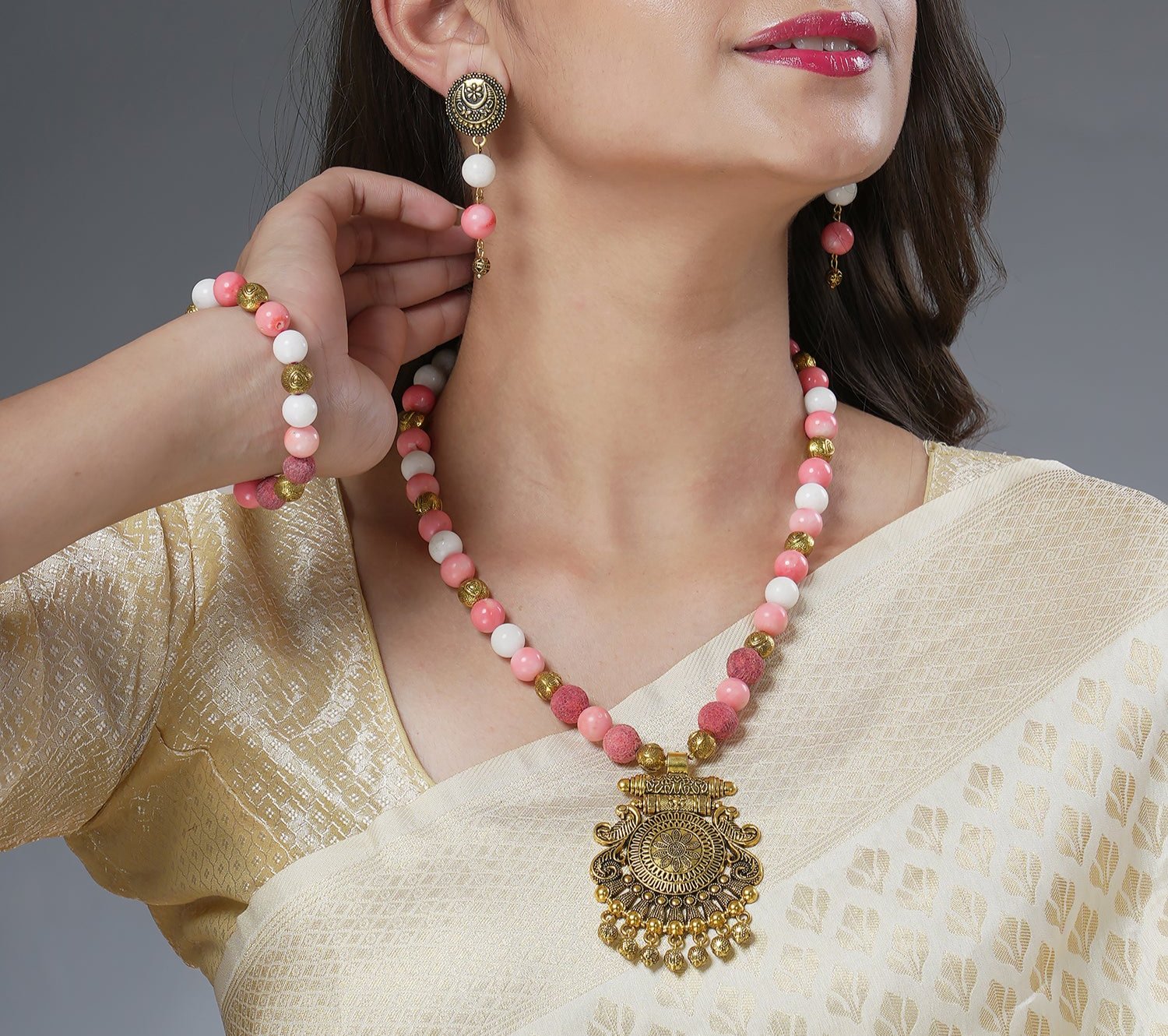 Elevate your style and well-being with this exquisite necklace and earring set, featuring the stunning combination of marble, real coral, and bamboo coral.