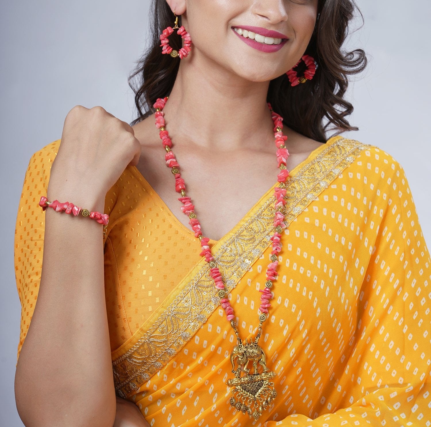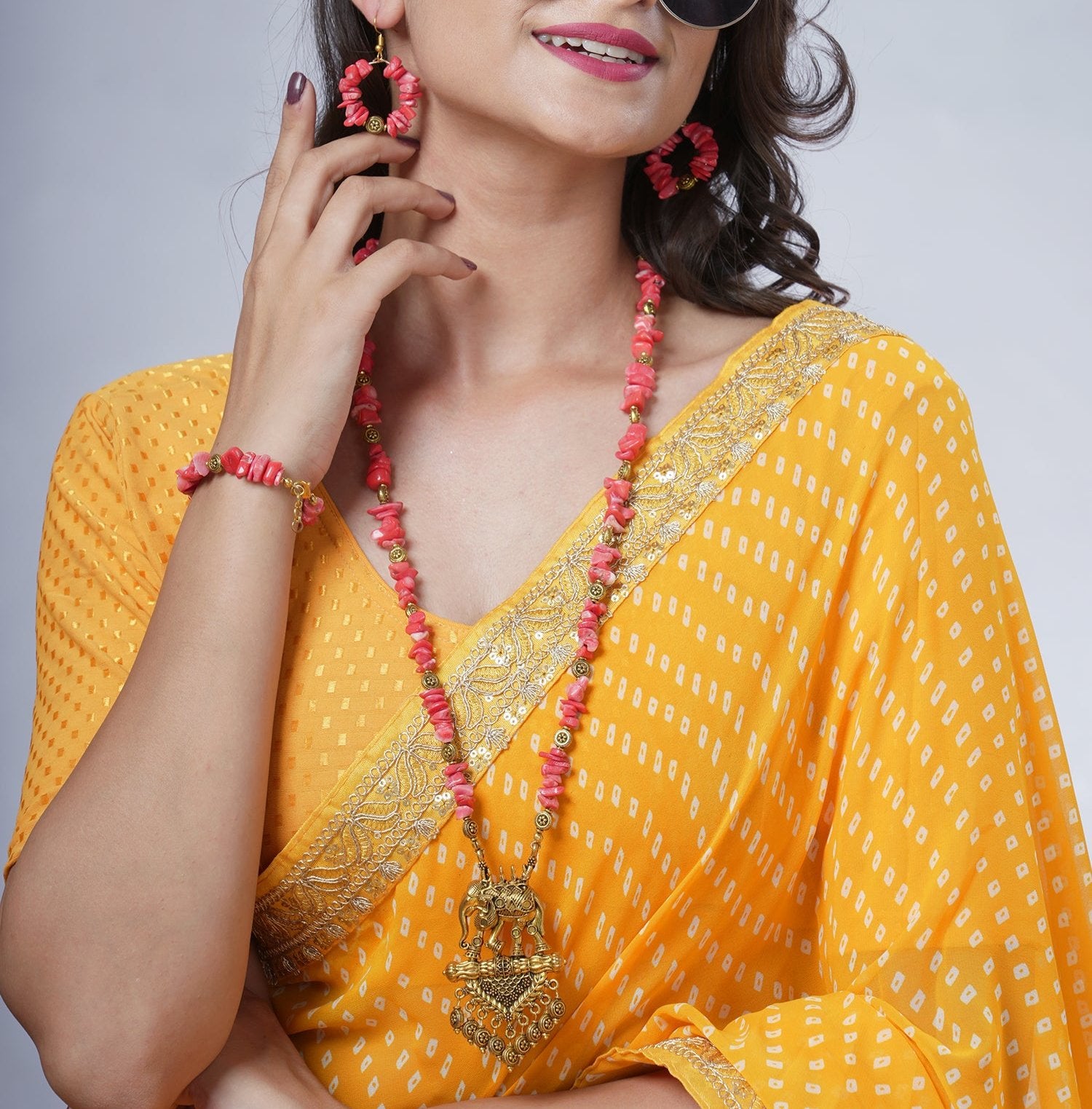 Elevate your style with this exquisite necklace and earring set, featuring the stunning beauty of uncut coral.