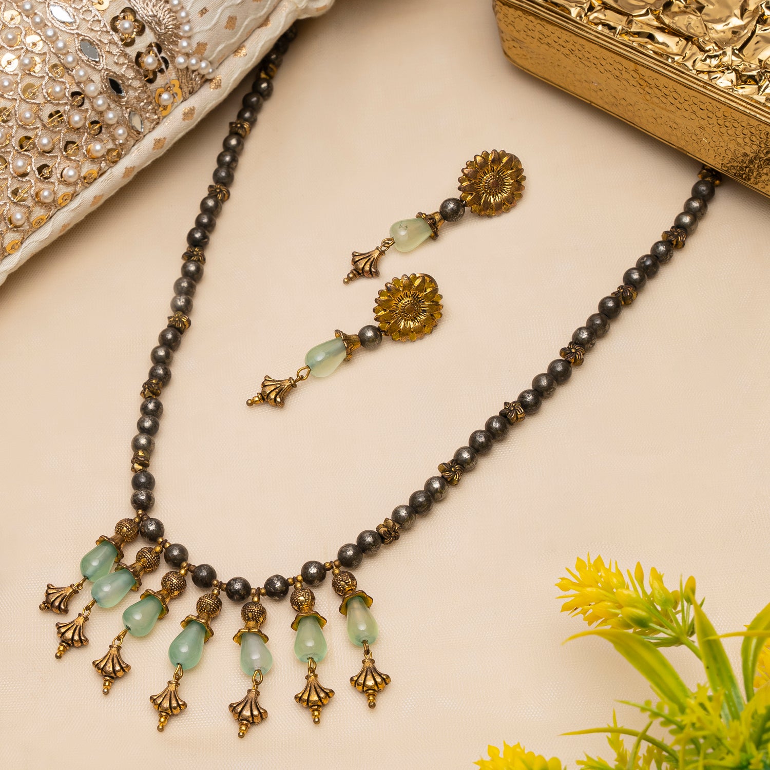 Elevate your style with this exquisite necklace and earring set, featuring the stunning combination of pyrite and green agate.