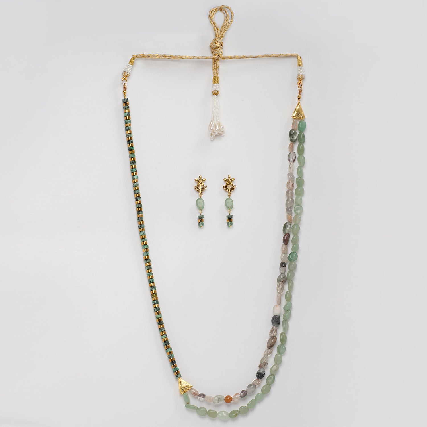 Elevate your style and well-being with this exquisite necklace and earring set, featuring a stunning combination of green aventurine, dalmatian, golden hematite, and jade.